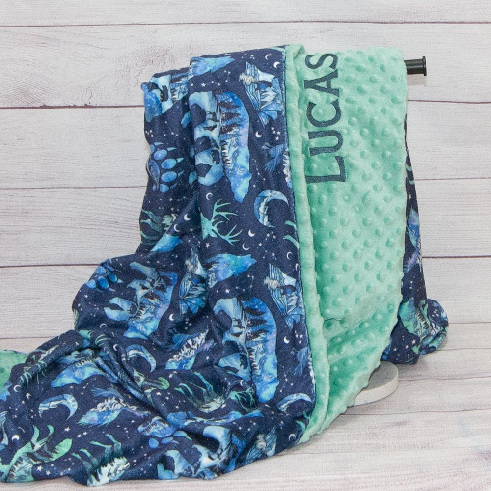 One side features a stunning wilderness print—bears, deer, foxes, and wolves against a dark blue sky filled with stars and mountains. The reverse side is made from luxuriously soft mint-green minky fabric, offering a soothing, sensory texture you’ll love to snuggle into.
