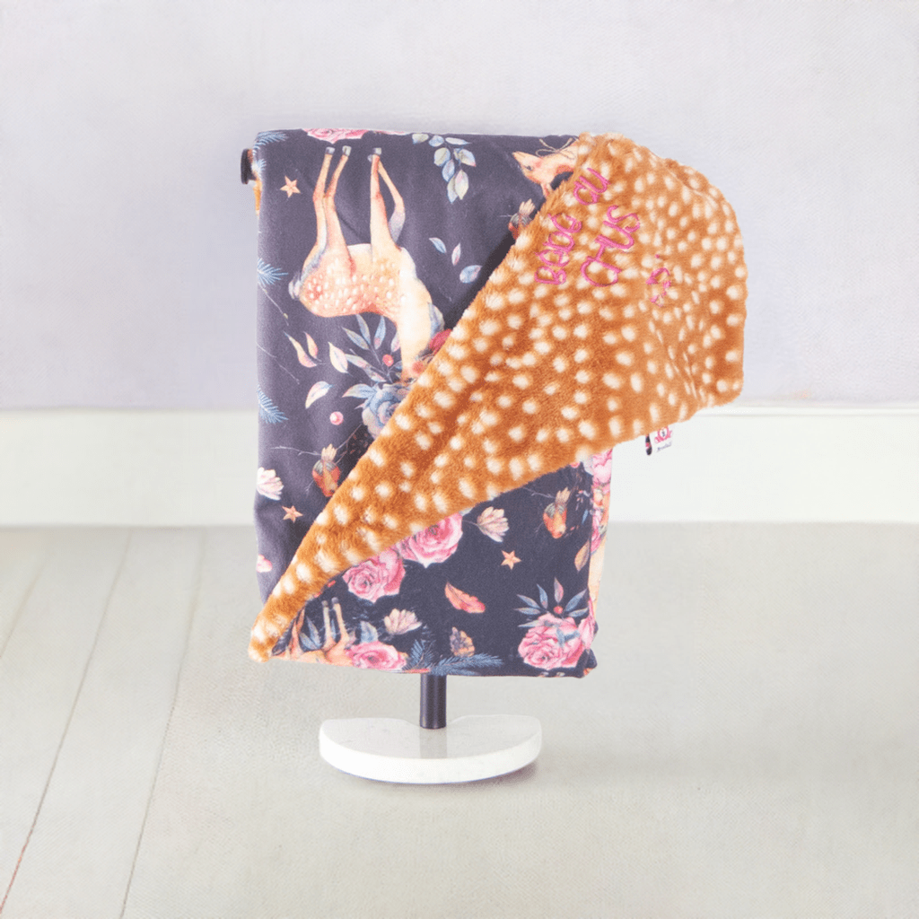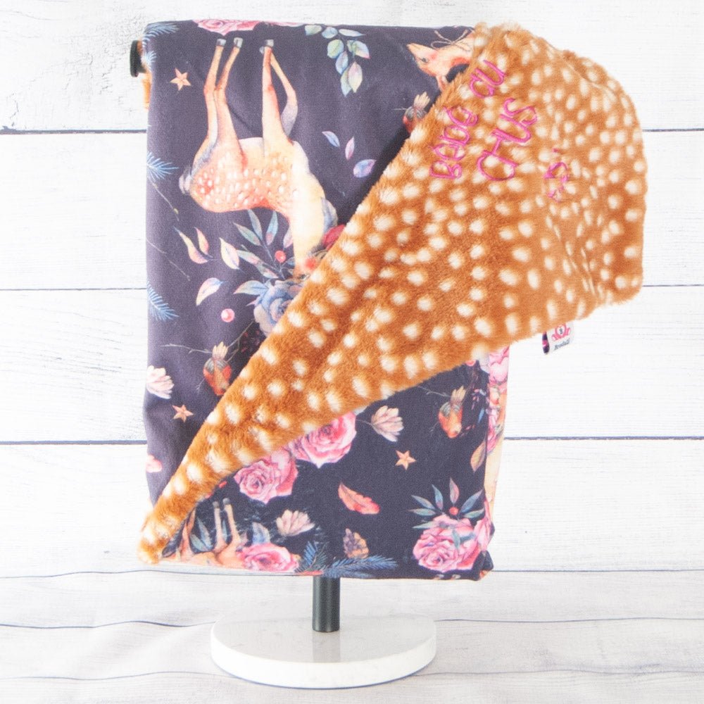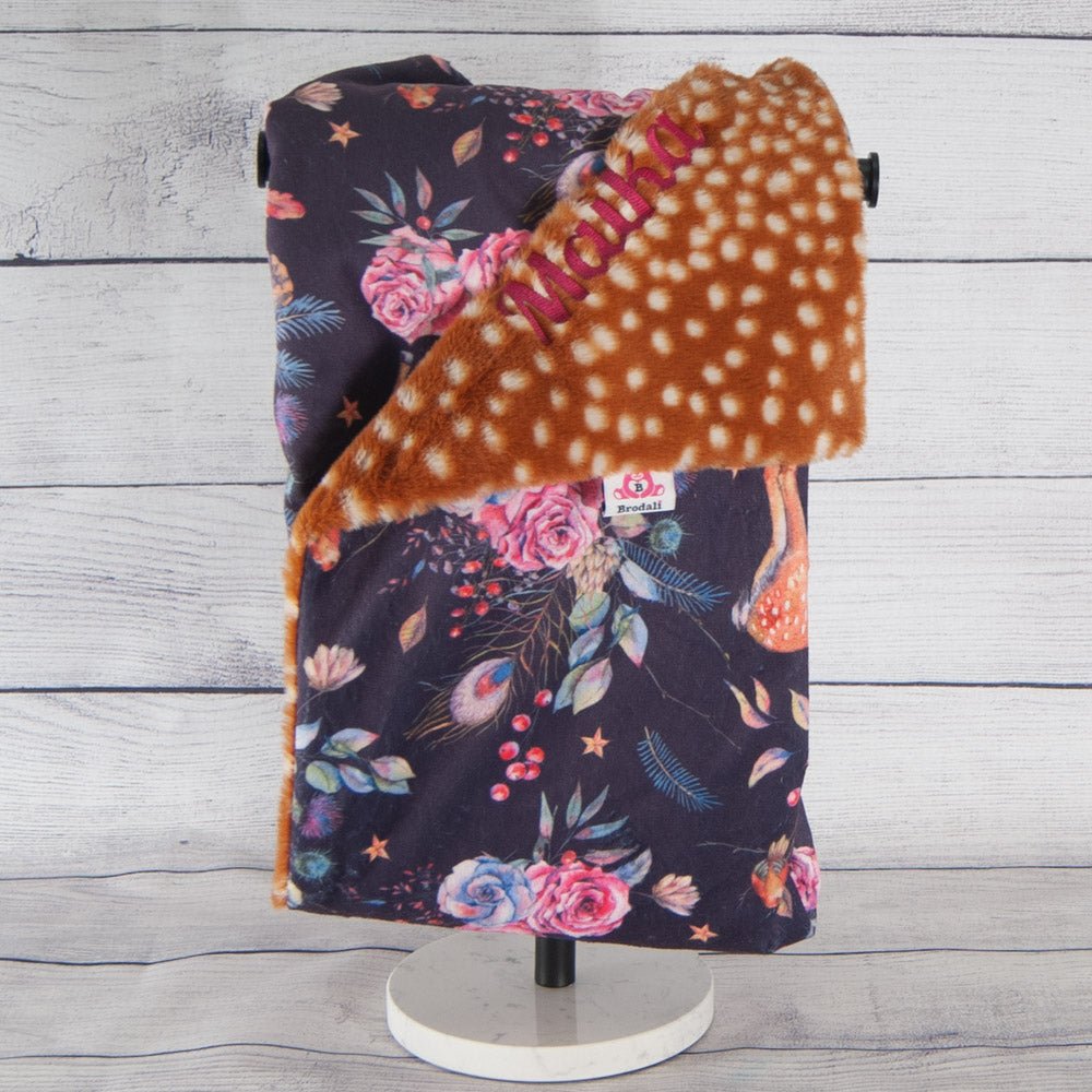 This 27x39 inch Baby Blanket is a perfect combination of comfort and personalization. One side features a soft minky fabric with a beautiful deer and flower design, while the other side is made of a luxurious brown fur with white spots for extra warmth and coziness. The blanket comes with personalized first name embroidery on the front, adding a special touch. Please note that due to the long fur, additional customizations cannot be added. It’s machine washable, but we recommend air drying (no dryer!) to preserve its softness. Ideal for naps, cuddles, and as a cherished keepsake!