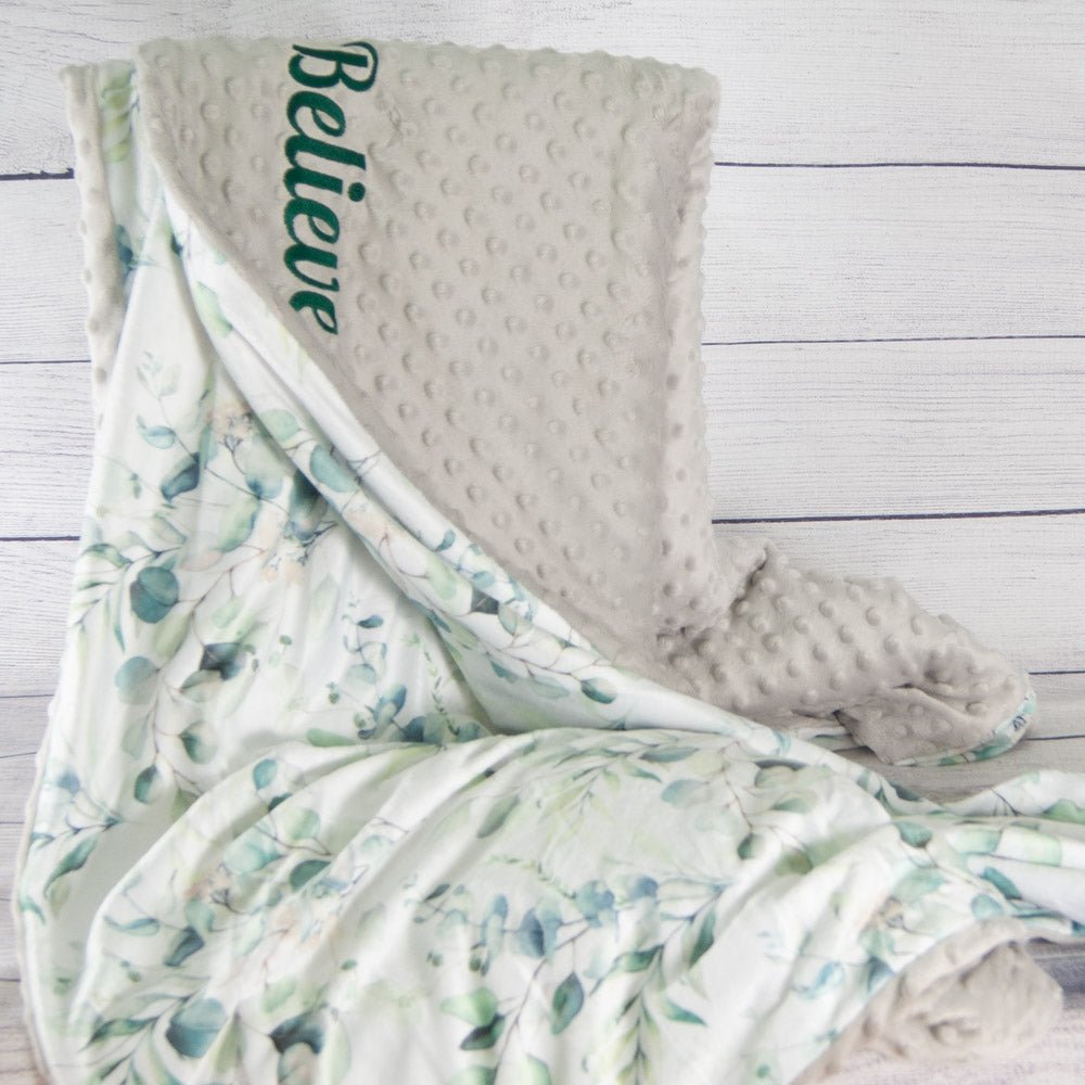 One side features a beautiful eucalyptus leaf print, bringing a fresh and tranquil feel to your home. The other side is a plush light grey minky fabric with raised dots, offering a soothing, sensory texture for extra coziness.