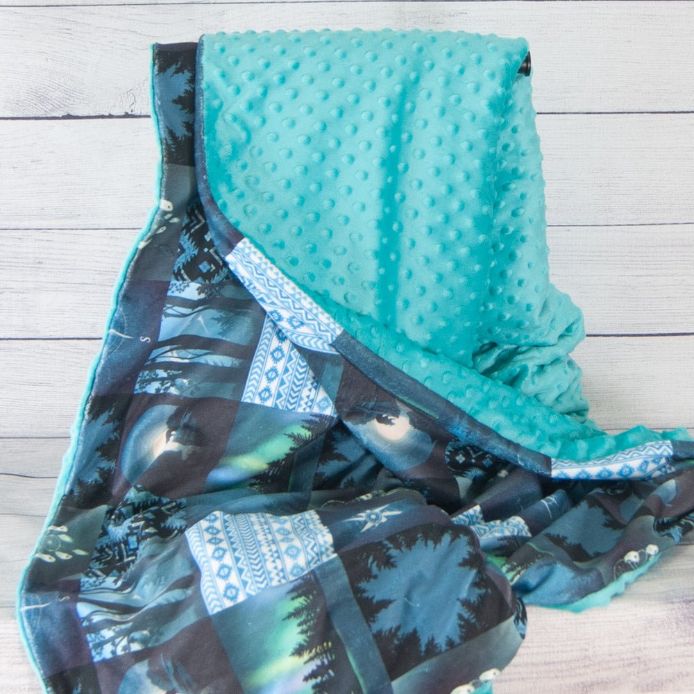 Experience the beauty of the great outdoors from the comfort of your home with this luxuriously soft minky blanket, inspired by the majestic northern lights and wildlife.
