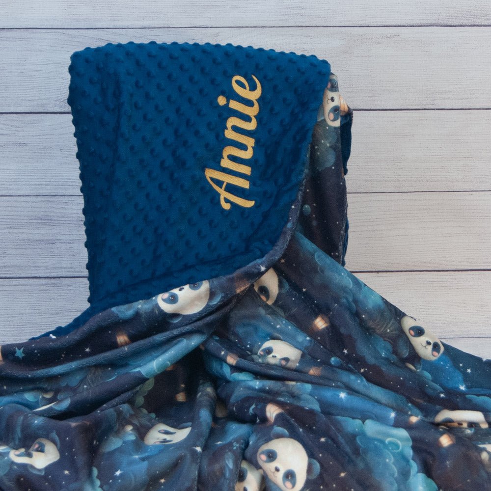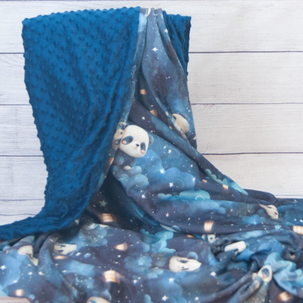 • One side features plush navy minky with raised dots, offering a soft, soothing texture perfect for cozy nights.