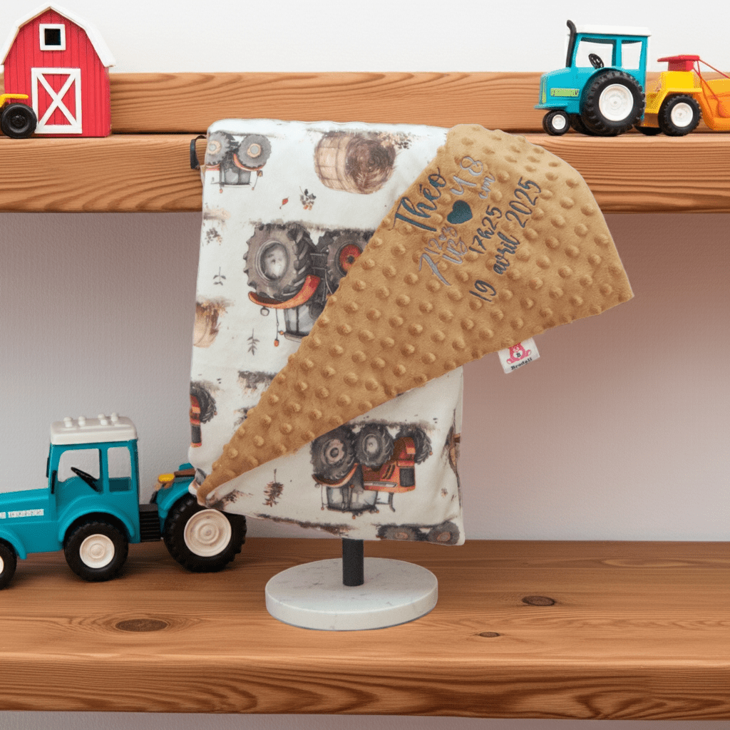 Designed for both style and softness, one side features a charming red tractor and hay bale print, perfect for little farm lovers, while the other side is a luxuriously soft light brown minky fabric for extra coziness. Whether at home or on an adventure, this blanket provides the perfect blend of warmth and lightweight comfort.
