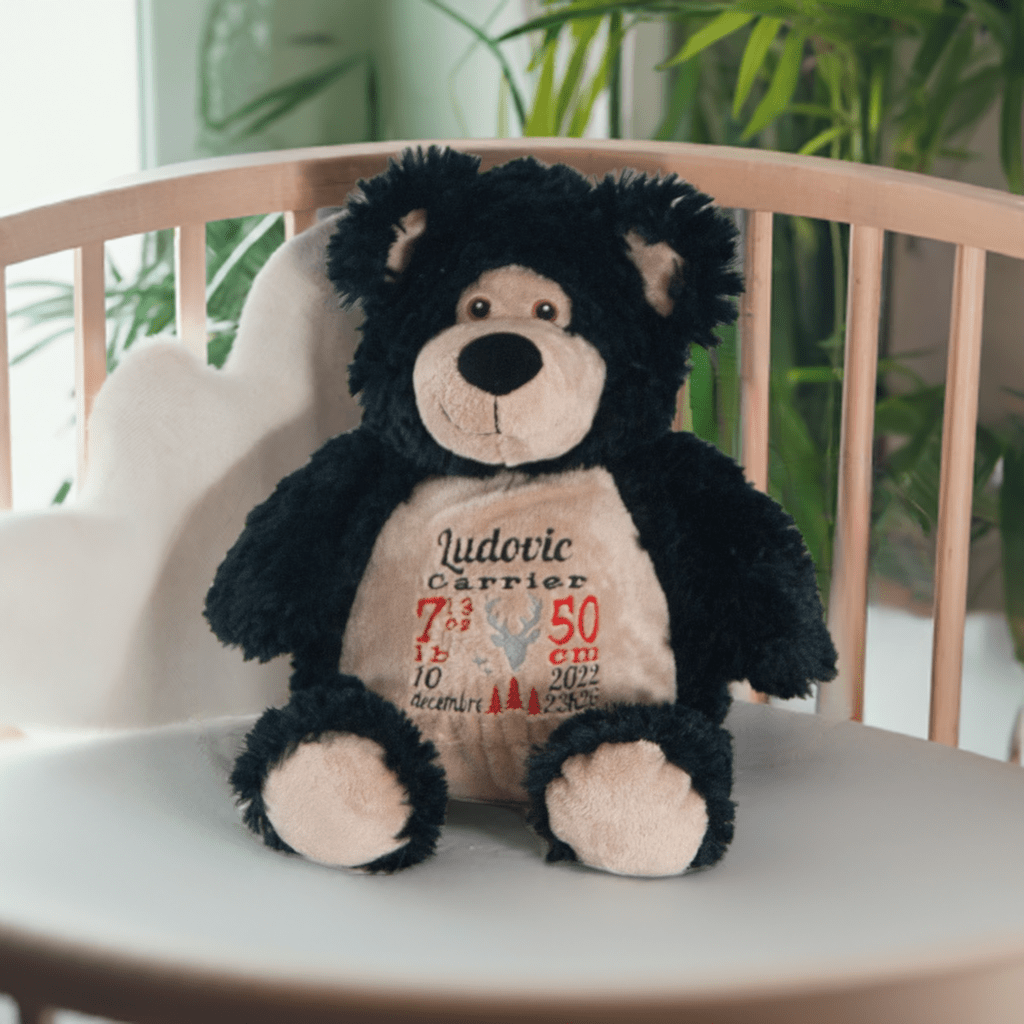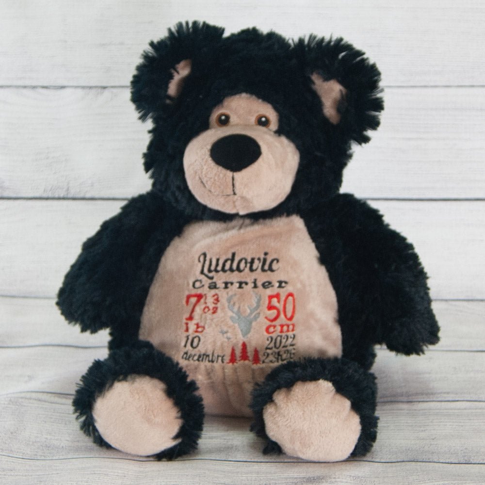 Meet Bear Kuujjuaq the Black, a 12-inch sitting teddy bear that’s as soft as it is special. This cuddly bear features custom embroidery on its belly, where you can choose to have all of your baby’s birth information or a heartfelt custom message. We’ll send you a preview of the embroidery design within a few days after your order is placed, so you can approve it before we stitch it. Bear Kuujjuaq the Black is easy to wash, making it a perfect keepsake that lasts. Please note, no accessories like bow ties are included. A thoughtful and personalized gift your little one will cherish!