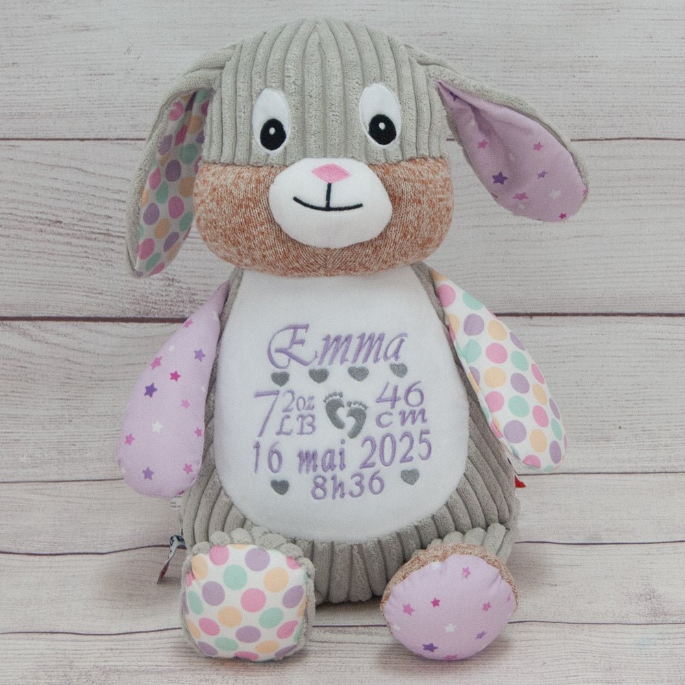 Meet Albany, the adorable grey and pink bunny with crinkly ears, perfect for cuddles and gifting! This plush bunny comes with custom embroidery, allowing you to personalize it with birth details or a special message—at no extra cost. Plus, shipping is just $5! Albany is easy to wash, making it a practical and lovable companion. Please note, no accessories are included. The embroidery design will be sent a few days after the order is placed. A sweet keepsake that's as soft as it is thoughtful!