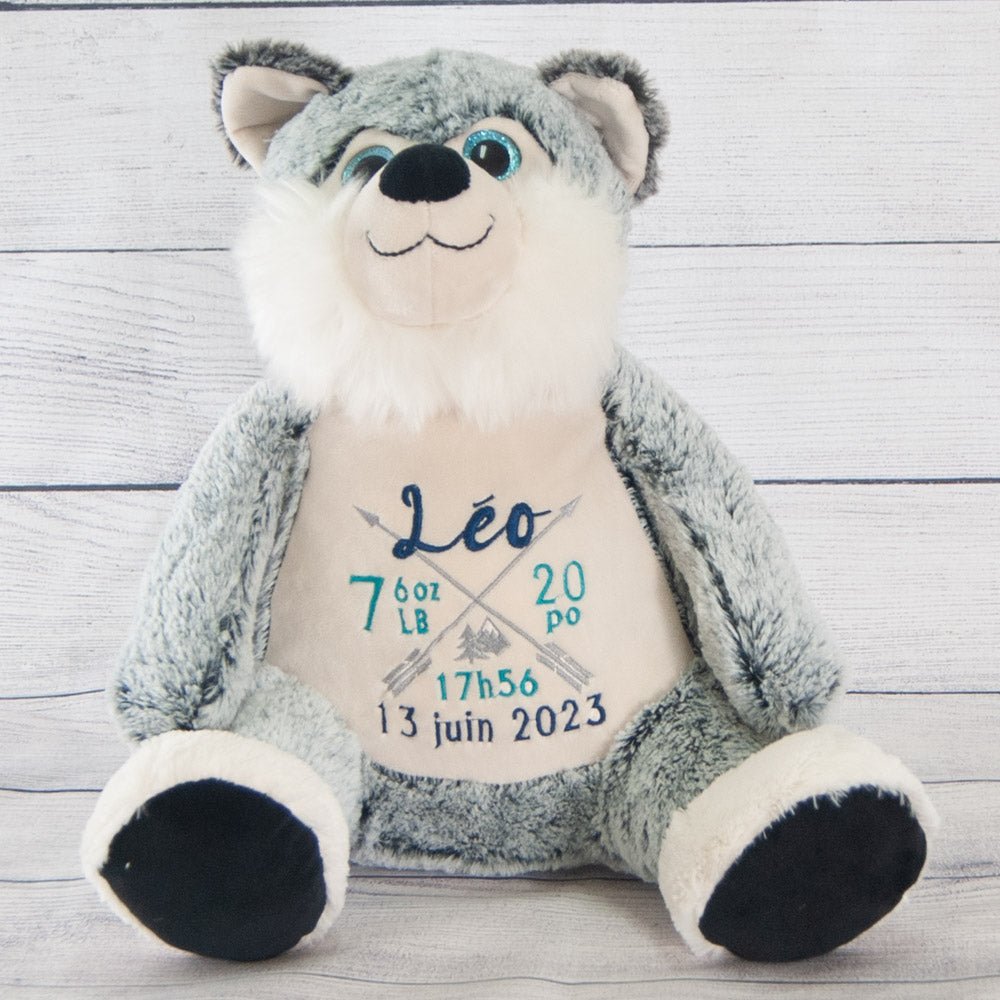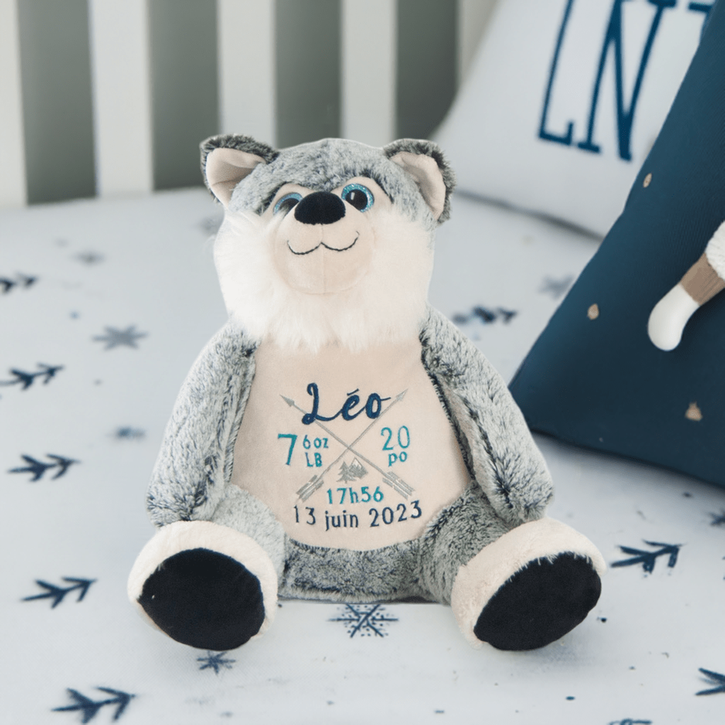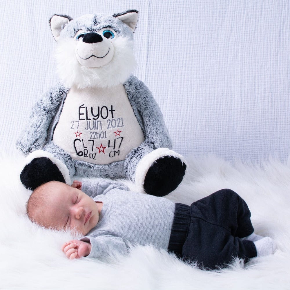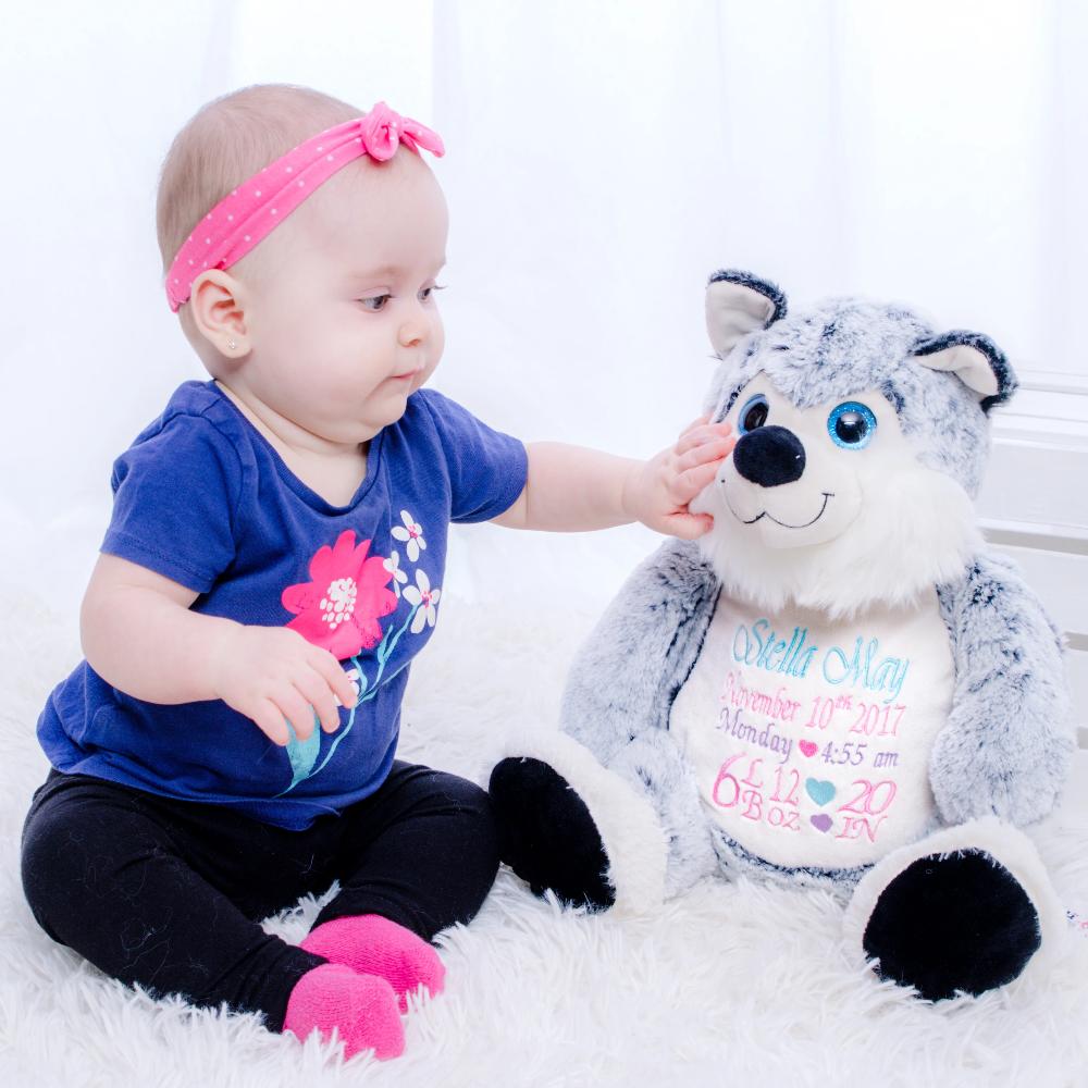 Custom Embroidery: The husky’s belly is embroidered with your choice of birth stats, name, or a personalized message. This thoughtful customization is included in the price!