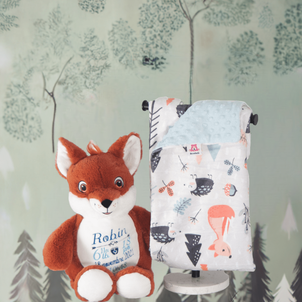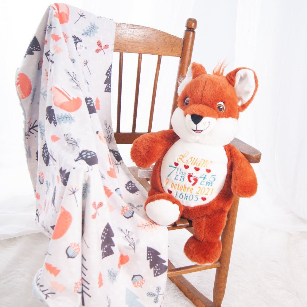 This charming baby gift set is the perfect way to celebrate a new arrival! It includes a stuffed red-haired fox and a soft minky baby blanket, both customizable to make it uniquely special for your little one.