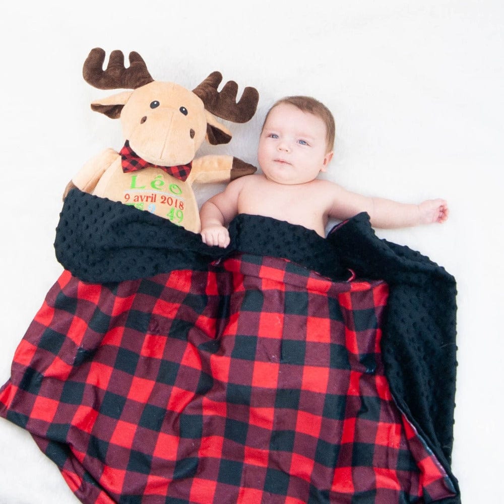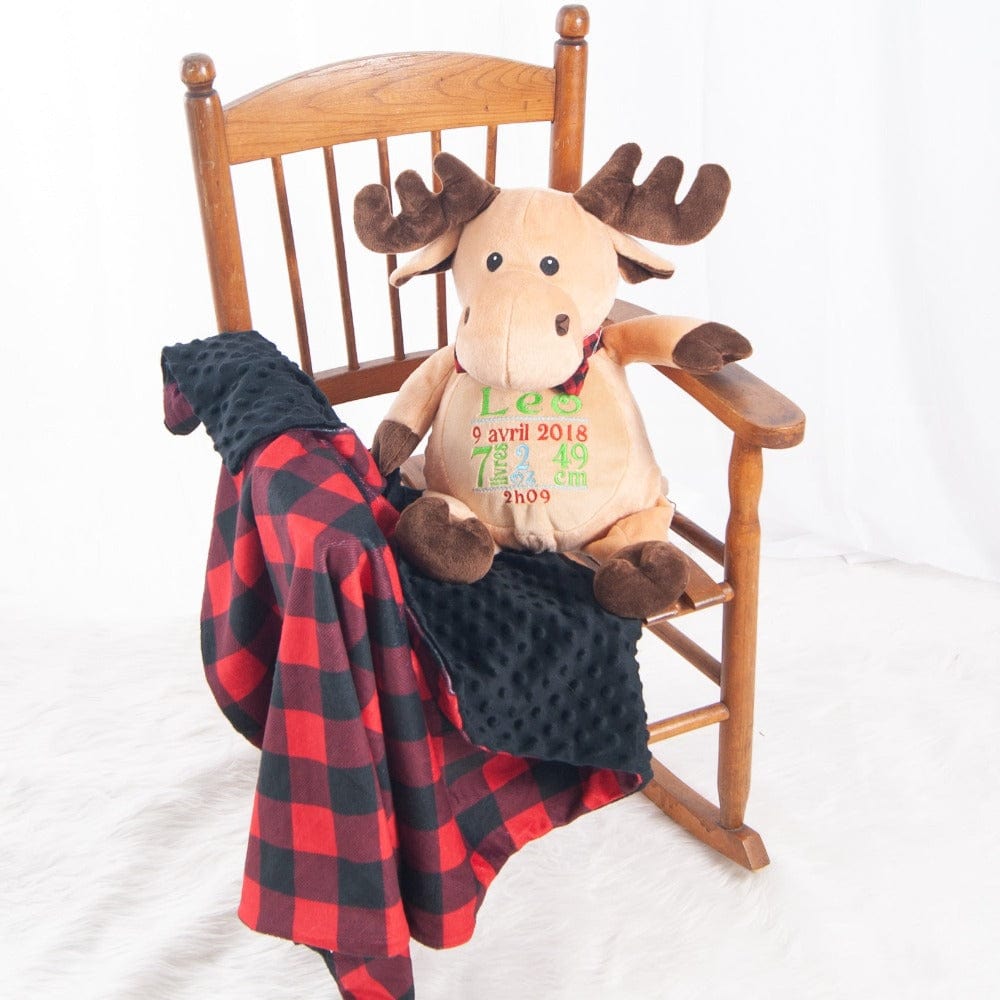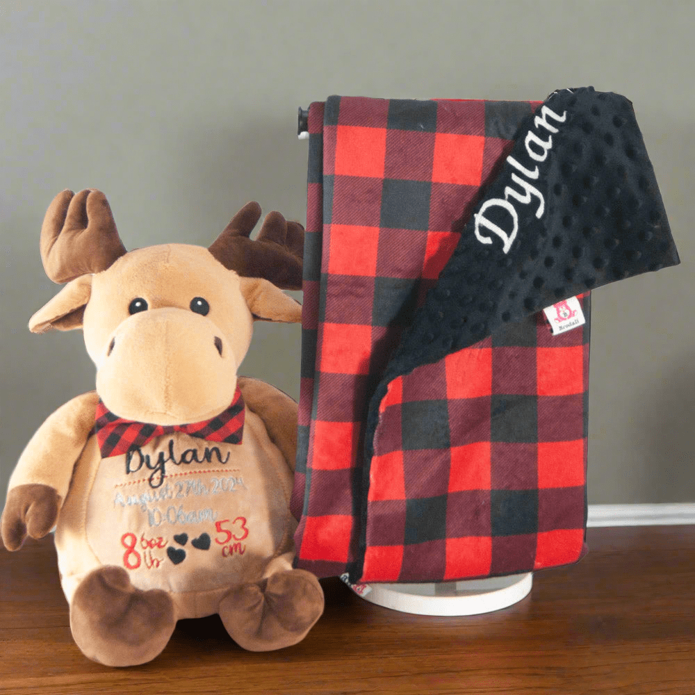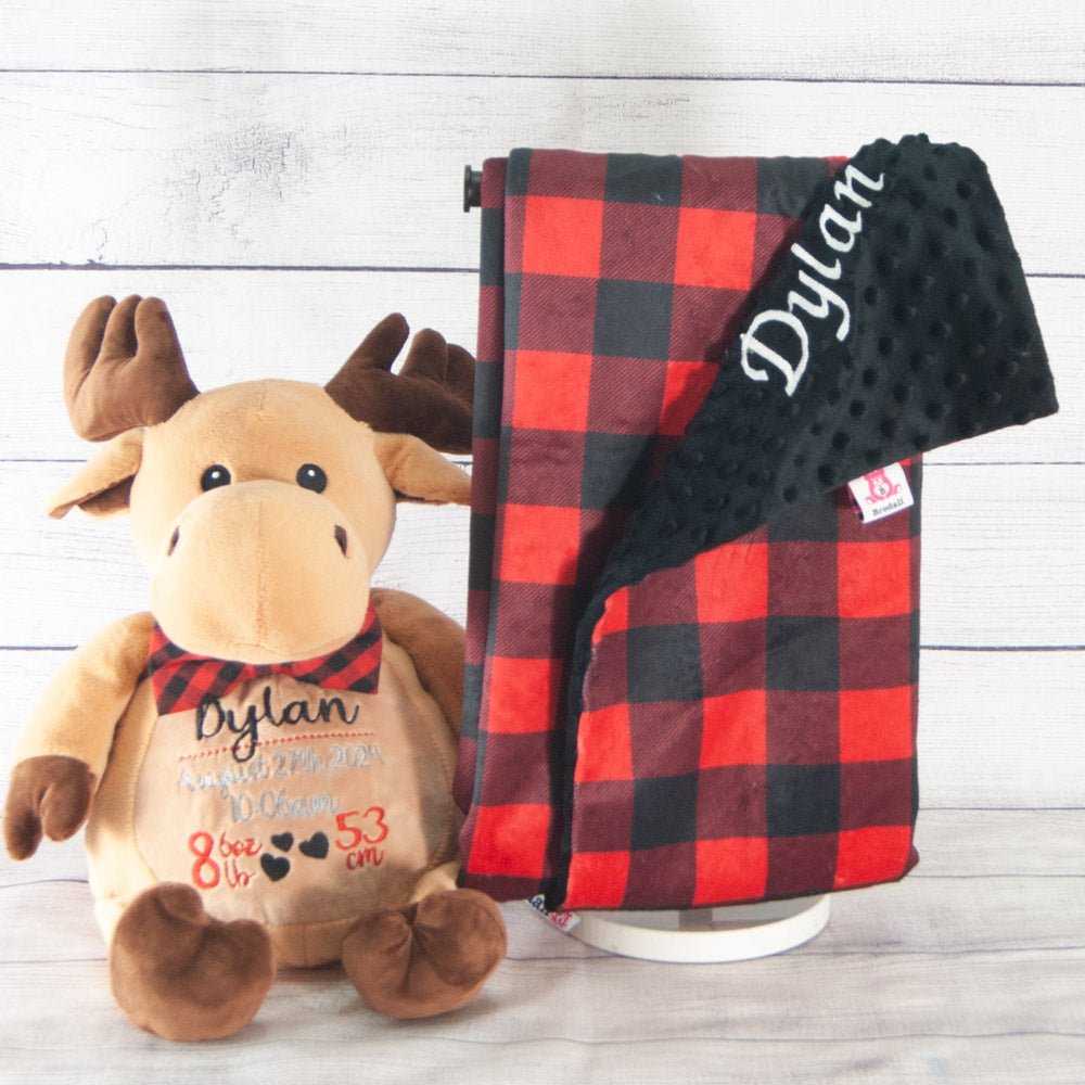Personalized Moose Teddy & Buffalo Plaid Baby Blanket Gift Set – A Cozy and Rustic Keepsake