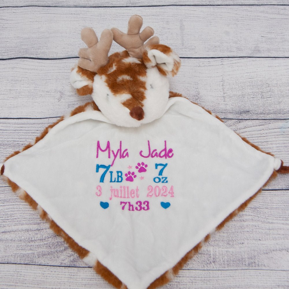 Give your little one the perfect cuddle companion with our Personalized Deer Baby Security Blanket! This ultra-soft, lightweight blanket features an adorable plush deer head and is just the right size for tiny hands to hold and carry everywhere.